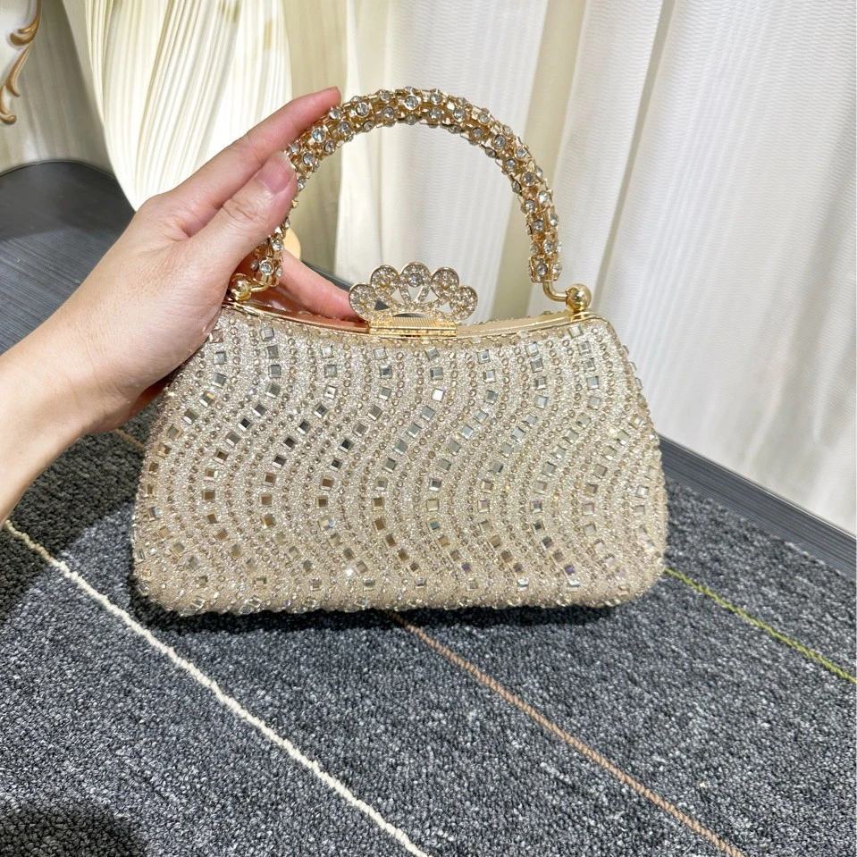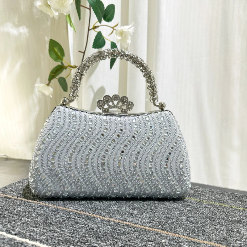 This diamond-encrusted evening handbag is designed to add elegance and personality to banquet outfits, evening dresses, and special occasion looks. The decorative finish enhances its fashionable appearance, making it suitable for formal events and social gatherings.