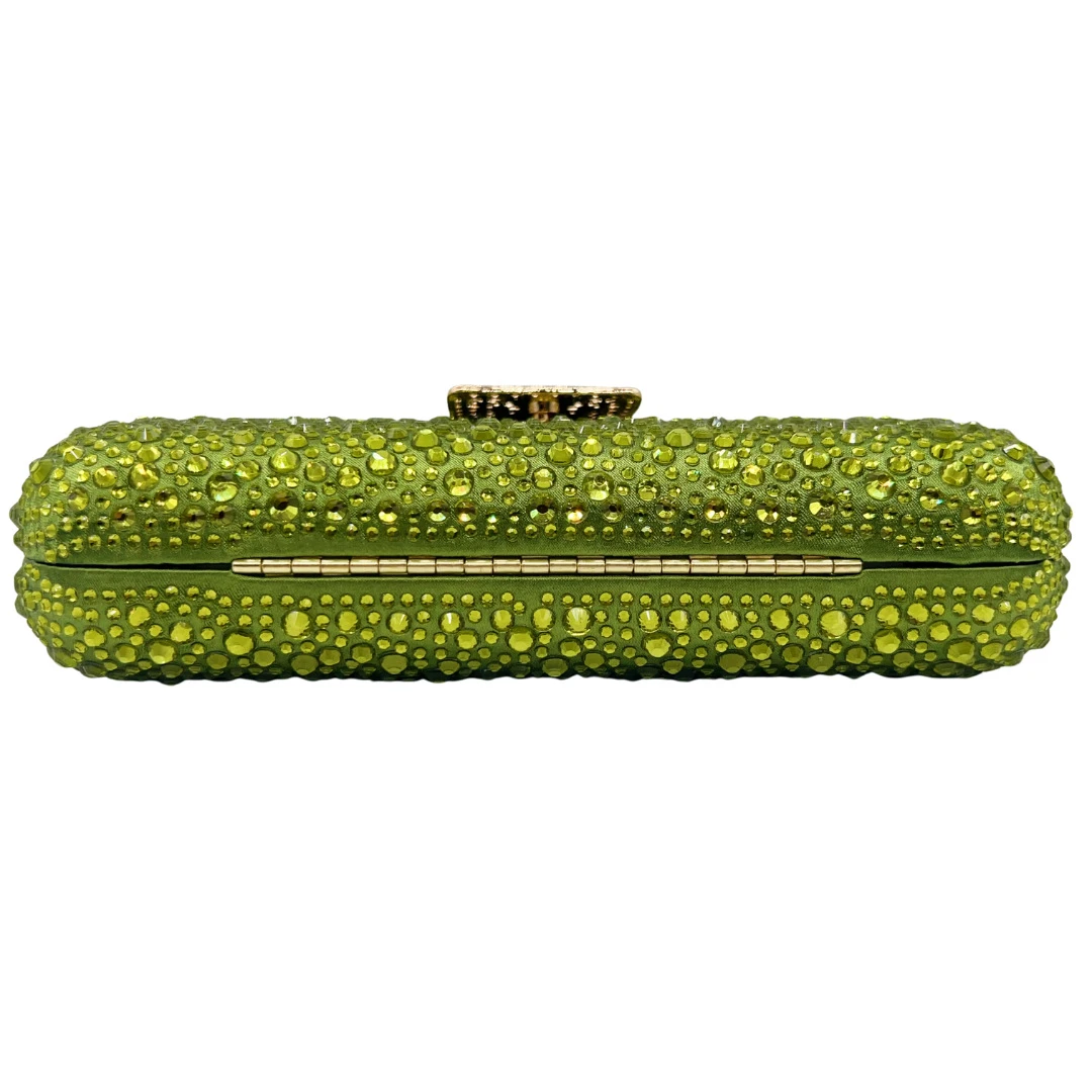 The compact clutch design offers space for essentials such as a phone, cards, and small personal items while maintaining a sleek and elegant silhouette. Its structured form keeps the bag polished throughout events and celebrations.
