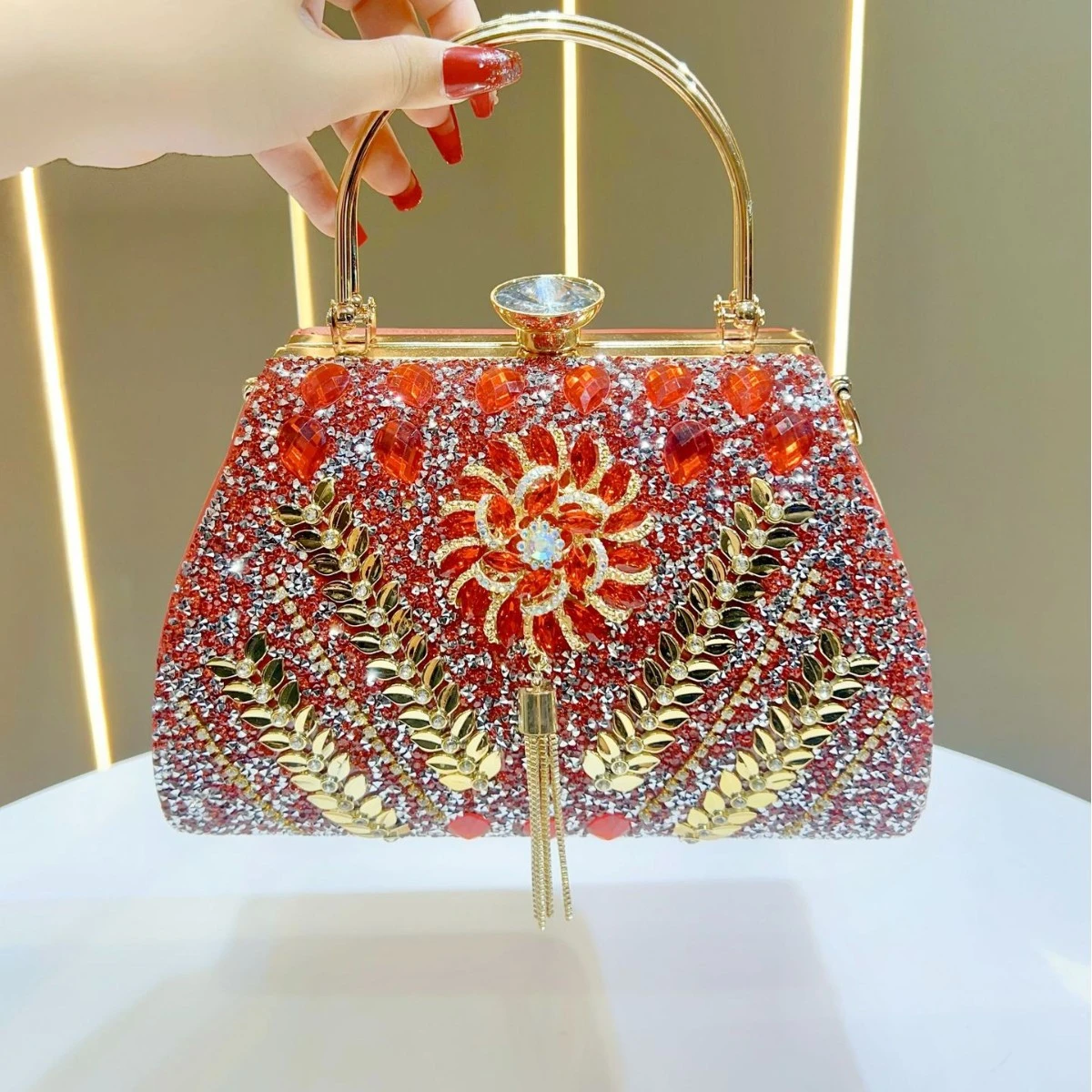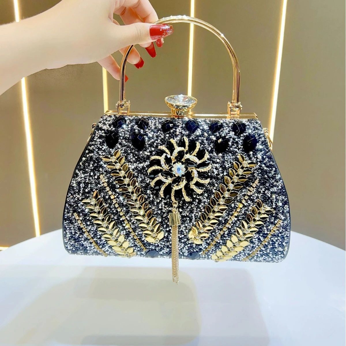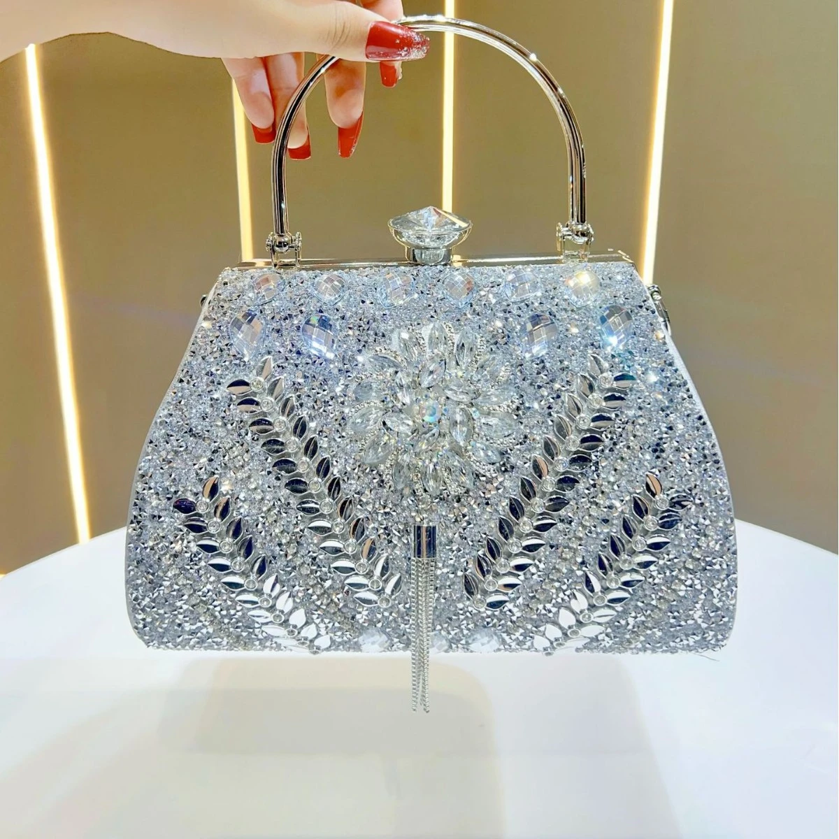 This large-capacity diamond-encrusted handbag is designed for women who want both elegance and practicality for evenings and special occasions. The decorative detailing adds a refined, high-end look suitable for social events and formal gatherings.